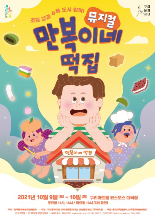 ‘만복이네 떡집’은 2010년 첫 출간 이후 꾸준히 사랑받으며 2019년 가장 많이 팔린 아동도서 1위로 선정된 김리리 작가 원작의 어린이 필독서로서, 구리문화재단은 이 작품을 시작으로 어린이 뮤지컬 제작 공연 사업을 시작하며 공공 공연장으로서의 역할을 강화할 계획이다.