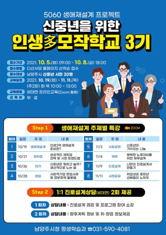 이번 생애재설계 과정은 비대면 온라인 방식으로 오는 10월 19일부터 11월 11일까지 4주간 운영될 예정이며, 인생 2막을 꿈꾸는 신중년 남양주 시민이라면 누구나 신청할 수 있다.