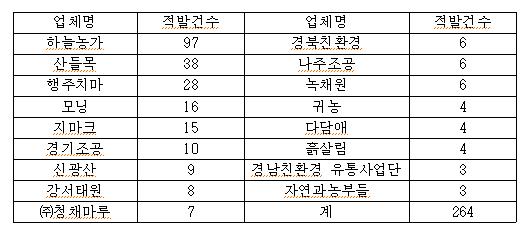 그러나 정작 서울시와 납품계약을 체결한 공급업체에 대한 징계는 전체 적발건수 281건 중 미조치 건수가 과반을 넘는 148건에 달하고 있으며, 감점 127건, 주의 5건, 경고 1건에 불과하고 생산농가와 같은 납입금지 조치는 단 한건도 없었다.