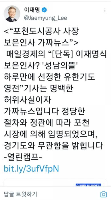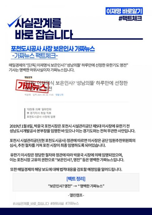 [포천뉴스타임=이명수기자] 24일 민주당 유력 대선후보 이재명 도지사는 SNS를 통해 "매일경제의 '[단독] 이재명식 보은인사? 성남의뜰 하루만에 선정한 유한기도 영전'기사는 명백한 허위사실이자 가짜뉴스입니다."라고 밝혔다.