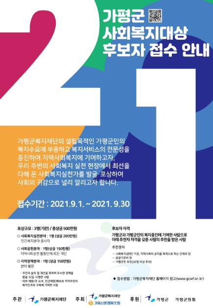 [한국뉴스타임=명기자] 가평군복지재단과 가평신용협동조합은 9월30일까지 '2021년 가평군사회복지대상' 수상 후보자 접수를 받는다.