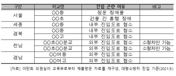 교육부는 2020년부터 소방청과 합동으로 ‘소방차 진입 불가 학교’를 조사하고 있으나, 전국 모든 학교가 아닌 시도별로 일부 학교만 임의로 선정해 조사하고 있다. 학교안전법과 교육시설법에 ‘소방차’에 대한 근거 규정이 미비하기 때문이다.