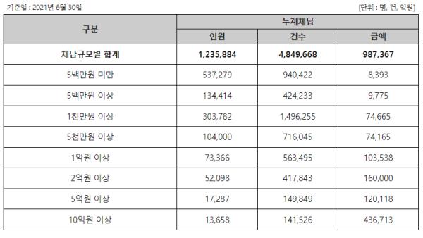 국세청이 공개한 현황자료를 보면 국세 누계체납액은 올해 6월 말을 기준 98조 7,367억 원에 이른다. 특히 눈에 띄는 것은 전체 누계체납 인원 123만6천여명 가운데 1만 4천여명에 불과한 10억 원 이상을 체납자의 누계체납액이 전체 누계체납액의 절반에 가까운 43조6,713억 원에 달한다는 점이다.
