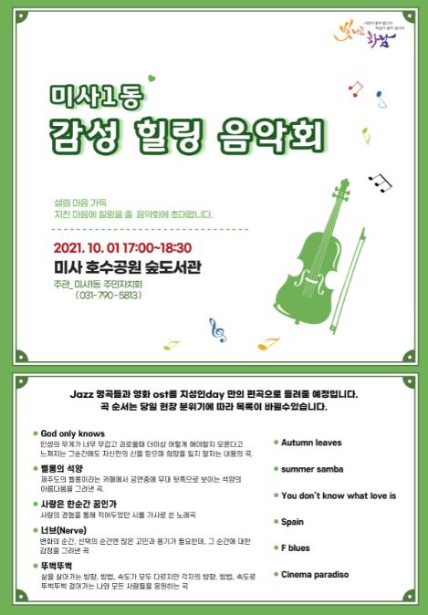 주민자치활성화 시범사업으로 추진하는 힐링음악회는 1일 미사호수공원 숲도서관(미사1동 행정복지센터 옆)에서 오후 5시부터 7시까지 열린다.