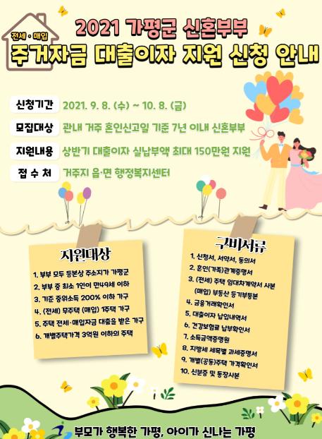 [한국뉴스타임=명기자] 가평군이 2021년 신혼부부 주거자금 대출이자 지원 사업을 실시한다. 전세자금, 매입자금의 대출이자를 최대 150만원 지원하며 오는 9월 8일부터 10월 8일까지 대상자를 모집한다.