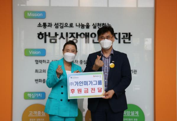 [한국뉴스타임=명기자] 건강한 아름다움을 만드는 글로벌 기업 ㈜가인미가그룹은 지난 29일 하남시장애인복지관을 방문하여 취학계층 장애인가정의 따뜻한 겨울나기를 위해 후원금 100만원을 전달하였다. 전달받은 후원금은 지역사회 취약계층 재가 장애인 가정에 따뜻한 겨울나기를 위한 복지기금으로 사용될 예정이다.