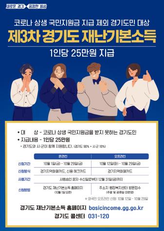 경기도는 행정안전부가 지난 9월 발표한 ‘코로나19 상생 국민지원금’ 개선안에 맞춰 제3차 경기도 재난기본소득을 나라사랑카드로도 발급한다고 3일 밝혔다. 지급액은 1인당 25만 원이다.