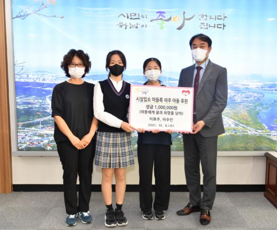 [한국뉴스타임=명기자] 하남시는 관내 거주 아동인 이효주(신평중 2학년), 이수민(신장초 6학년)학생이 6일 시장실에서 학대 피해 아동 보호를 위한 성금 100만원을 기탁했다고 밝혔다.