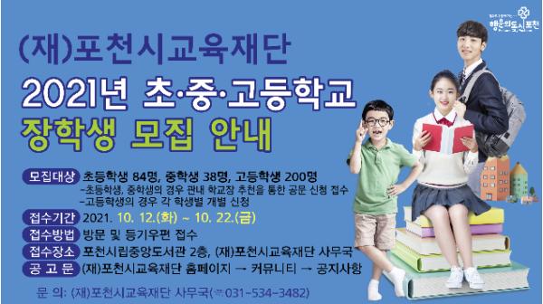 (재)포천시교육재단은 우수한 지역 인재를 발굴․육성하고 포천시 교육 발전을 위해 공헌한 우수 교원을 지원하고자 ‘2021년 초·중·고등학교 장학생 및 우수교원’을 모집한다고 밝혔다.