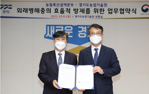 [한국뉴스타임=명기자] 경기도농업기술원이 8일 화성 도 농기원에서 농림축산검역본부와 도내 농작물에 큰 피해를 주는 외래병해충 차단 확산과 효율적 방제를 위한 업무협약을 체결했다.