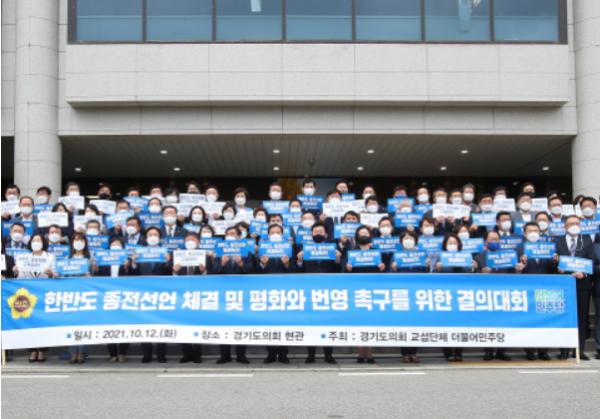 [한국뉴스타임=명기자] 경기도의회 교섭단체 더불어민주당(대표의원 박근철, 의왕1)은 12일 355회 임시회 2차 본회의에 앞서 의회 현관 앞에서 ‘한반도 종전선언 체결 및 평화와 번영을 위한 결의대회’를 개최했다.
