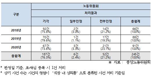 연도별로 살펴보면 노동위원회의 부당해고 인정(일부인정‧전부인정 포함) 건수는 2018년 전체 66건 중 16건이었으며, 2019년에는 88건 중 18건이 부당해고 판정이 나와 가해자가 구제되었다. 2020년은 91건 중 24건이 부당해고 판정이 나와 가해자가 구제되었다. ‘일부인정’은 징계사항이 복수인 경우 그중 일부만 부당 판정으로 인정한 것을 말한다.