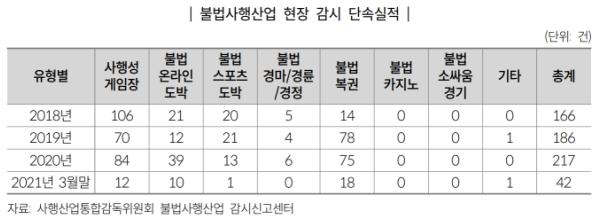 사감위 자료에 따르면 불법사행산업 현장감시 단속 건수는 2018년 166건, 2019년 186건, 2020년 217건으로 계속해서 증가하고 있다. 그러나 온라인 감시 단속의 경우 2019년 VPN, 우회사이트, 등 단속 회피를 위한 기술이 본격적으로 사용되면서 2019년 16,476건, 2020 20,928건을 기록하며 2018년 25,521건 수준의 실적을 회복하지 못하고 있다.