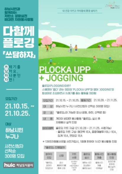 이번 캠페인은 하남시민이면 누구나 참여가 가능하며, 10월 15일부터 25일까지 11일간 하남도시공사 홈페이지를 통해 사전신청자(300명)를 모집하고, 원활한 플로깅을 위한 플로깅 키트(에코백, 집게, 면장갑, 쓰레기종량제봉투(10ℓ), 마스크)도 제공될 예정이다.