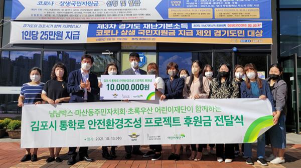 [한국뉴스타임=명기자] 박상혁 국회의원(김포시을)은 마산동 주민자치회 하교 안전지도자‘왓쳐’- 프리미엄 배달 플랫폼‘냠냠박스’- 초록우산 어린이재단이 함께 하는 김포시 어린이 통학로 안전환경조성 프로젝트 후원금 전달식에 함께했다고 14일 밝혔다.