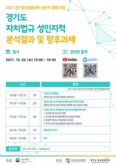 여성가족부가 주최하고 경기도양성평등센터(여성가족부 지정)가 주관하는 이번 포럼은 최근 재단이 완료한 ‘경기도 자치법규에 대한 성인지적 분석’ 연구 결과를 중심으로 진행한다. 경기도 자치법규(조례, 규칙)를 성인지 관점에서 검토하고, 자치법규에 대한 성별영향평가 현황 및 개선 사항을 논의한다.