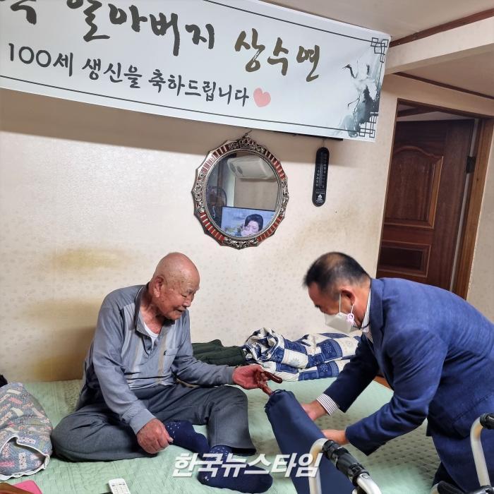 [가평뉴스타임=명기자] 가평읍 행정복지센터는 19일「제25회 노인의 날」을 기념해 관내 거주하시는 100세 어르신 두 분께 장수지팡이(청려장)와 문재인 대통령 축하카드를 직접 전달했다.
