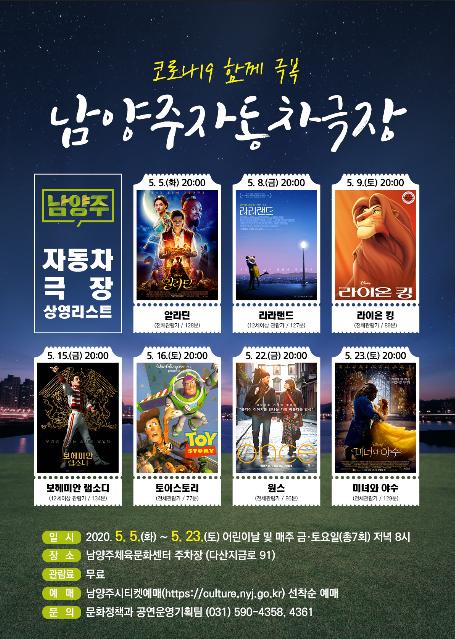 남양주시(시장 조광한)는 5월 가정의 달을 맞이해 코로나19의 여파로 일상에 지친 시민들을 위한 ‘코로나19 함께 극복 「남양주자동차극장」’을 5월 5일(화)부터 5월 23일(토)까지 남양주체육문화센터 주차장(다산지금로 91)에서 운영한다고 밝혔다.