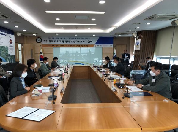 경기경제청은 21일 오후 2시 평택항 마린센터 8층 회의실에서 (주)스마트켐, (주)JPC, ㈜성우이에스, ㈜인찬 등 소·부·장 기업 4곳, 평택시와 ‘평택 포승(BIX)지구 산업시설 용지 입주를 위한 투자협약’을 체결했다.