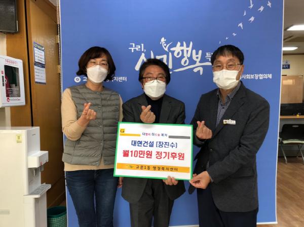 [한국뉴스타임=명기자] 구리시는 18일 교문1동 행정복지센터에서 대현건설 장진수 대표와 ‘행복드림 냉장고 사업’월 10만원 정기 후원금 전달식을 가졌다.