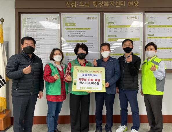 [한국뉴스타임=명기자] 남양주시 진접오남행정복지센터는 지난 21일 철마기업인회에서 동절기 대비 사랑의 김장 후원금 200만원을 진접읍 새마을부녀회를 통해 기부했다고 밝혔다.