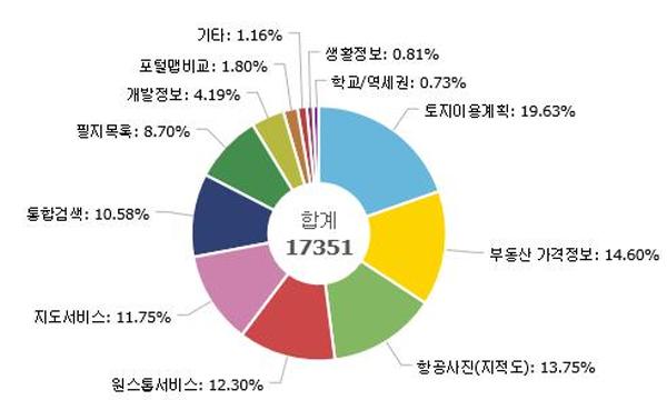 이용자들이 자주 이용하는 콘텐츠를 물어보니 토지이용계획 19.6%, 부동산가격정보 14.6%, 항공사진 지적도 13.7% 순이었다. 또한 이용자들은 토지정보 43.6%, 매물정보 18.1%, 이용계획 15.2% 등의 순으로 관심이 많았다.