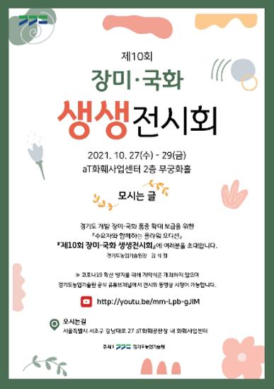 [한국뉴스타임=명기자] 경기도농업기술원이 10월 27일부터 29일까지 서울 양재동 aT화훼공판장 화훼산업센터 2층 무궁화 홀에서 ‘제10회 장미·국화 생생전시회’를 연다.