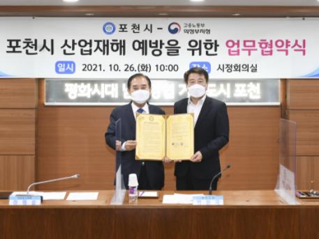 [한국뉴스타임=명기자] 포천시는 26일 시청 시정회의실에서 중부지방고용노동청 의정부지청과 포천시 산업재해 예방을 위한 업무협약을 체결했다.