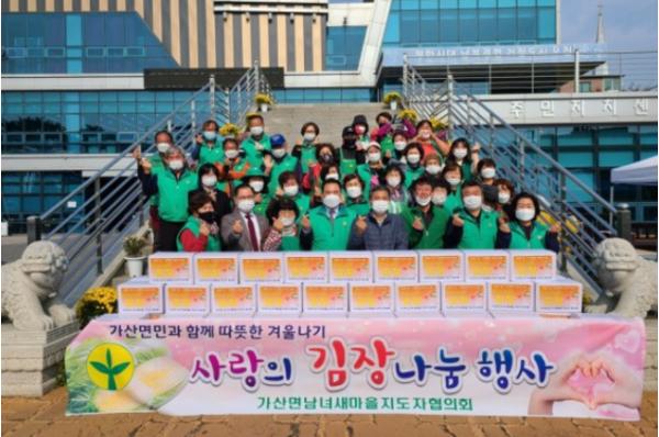 코로나19 장기화로 어려움을 겪고 있는 이웃을 위해 진행된 이번 행사는 가산면 새마을 남․여 지도자 50여 명이 참여해 직접 키운 배추와 무로 김장김치를 담가 관내 어려운 이웃에게 나눔을 실천했다.