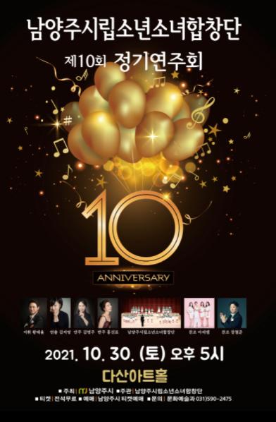 2012년 2월 29일 창단된 남양주시립소년소녀합창단은 올해로 10주년을 맞았으며, 이를 기념하기 위해 기획된 이번 공연은 합창단의 10년간 발자취를 돌아보는 영상으로 시작돼 ‘넬라판타지아(Nella Fantasia)’, ‘아이캔필더리듬(I can feel the Rhythm)’, ‘스마일 어게인(Smile Again)’ 등 악기와 춤이 함께하는 풍성한 공연 레퍼토리를 선보일 예정이다.