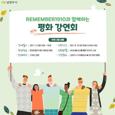 [한국뉴스타임=명기자] 남양주시는 오는 11월 5일 REMEMBER 1910에서 평화를 주제로 한 '리멤버N클래스' 인문학 강연회를 개최한다.