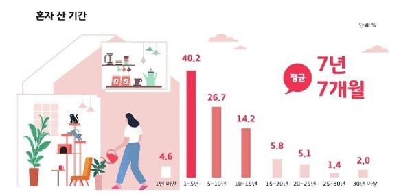 혼자 산 기간은 평균 7년 7개월로, 1~5년이 전체 40.2%로 가장 많았고 30년 이상도 2.0%에 달했다. 혼자 생활하는 이유는 ▲본인의 직장 또는 학교와의 거리 31.2% ▲배우자와 이혼·별거 21.5% ▲가족과 사별 20.5% ▲개인 편의와 자유 18.5% 등의 순이다.