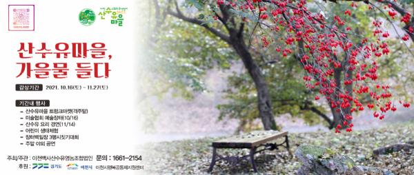 이 중 이천시 산수유 마을은 10월 16일부터 11월 27일까지 ‘산수유마을, 가을물 들다’ 행사주간을 운영해 격주 주말마다 마을의 주차장 공간을 활용해 거리두기형 이색장터인 ‘트렁크마켓’을 열고 있으며, 관내 초등학생을 대상으로 생태 숲 체험도 진행하고 있다. 11월 14일에는 산수유를 주제로 한 ‘이야기가 있는 산수유밥상’ 요리경연 대회를 개최할 예정이다.