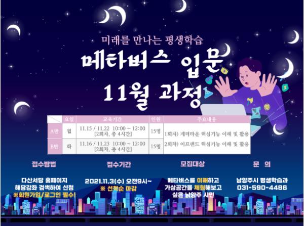 한편, 시는 위드 코로나 시대에도 지속 가능한 평생학습 체계를 마련하기 위해 메타버스 플랫폼 내에 캠퍼스를 구현하는 등 남양주시만의 특화된 평생학습 공간을 마련할 계획이며, 메타버스 관련 과정 및 플랫폼을 활용한 강의를 점차 확대해 나갈 방침이다.