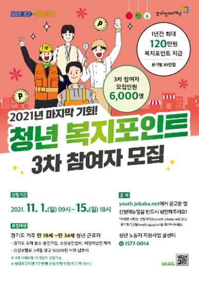 [한국뉴스타임=명기자] 경기도가 도내 청년 노동자들의 복리후생과 처우 개선을 위한 ‘청년 복지포인트’ 3차 참여자 6,000명을 11월 15일까지 공개 모집한다.