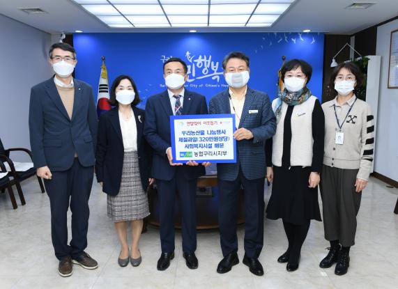 농협 구리시지부는 우리 농산물 소비 촉진과 사회공헌 활동 전개를 목적으로 지속적인 나눔을 실천하고 있다. 이번 연말 맞이 우리 농산물 나눔 행사에도 관내 사회복지시설 7개소에 사과, 배, 포도, 귤 등 약 320만원 상당의 제철 과일을 전달했다.