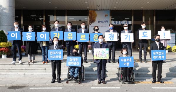 한편, 이날 기념행사에서 보건복지위원회 방재율 위원장, 최종현 부위원장, 이혜원 부위원장, 김영준 의원, 박재만 의원, (사)경기도지체장애인협회장과 장애인식개선 강사로 활동하는 휠체어 이용자 2명 등 참석자들은 ‘이동이 자유로운 경기도!’라는 문구를 들고 편의시설 안내 스마트앱 개시를 축하했다.