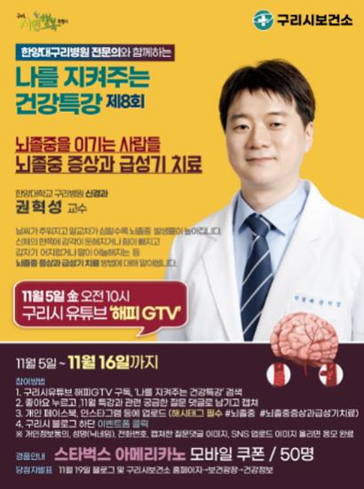 [한국뉴스타임=명기자] 구리시는 5일 구리시 공식 유튜브 한양대구리병원 전문의와 함께하는 나를 지켜주는 건강특강 11월 ‘뇌졸중을 이기는 사람들’편을 방송했다.