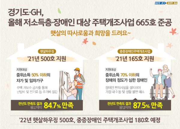 [한국뉴스타임=명기자] 경기도와 경기주택도시공사(GH)는 주거취약계층 주거환경 개선 사업으로 저소득 가구 대상 ‘햇살하우징’ 500호, ‘중증장애인 주택개조사업’ 165호 등을 준공해 올해 목표치 665호를 달성했다고 7일 밝혔다.