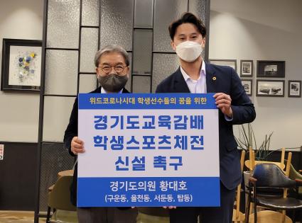 황대호 의원은 지난 4일 이재정 교육감과 면담을 갖고 경기도교육청이 직접 주최·주관하는 체육대회인 ‘경기도학생스포츠체전’의 개최를 제안했다고 8일 밝혔다. 만일 제안대로 ‘경기도학생스포츠체전’이 내년에 즉시 개최된다면 지난 2015년까지 제40회에 걸쳐 개최한 후 막을 내렸던 ‘경기도학생체전’이 7년 만에 부활하는 셈이 된다.