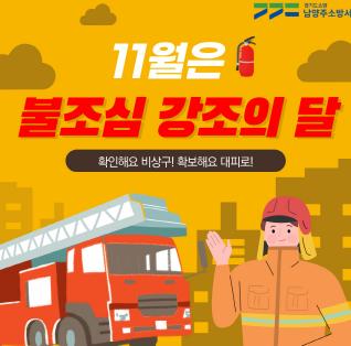 [한국뉴스타임=명기자] 남양주소방서는 11월 한달 간 화재예방 안전환경 조성을 위한 '불조심 강조의 달'을 운영하고 있다고 8일 밝혔다.