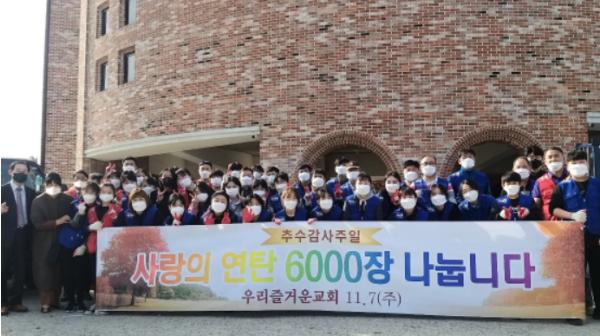 올해 17회를 맞은 사랑의 연탄 나눔 행사는 ‘우리즐거운교회’에서 추수감사절 헌금을 사용해 지역사회에 사랑과 나눔을 실천하자는 취지로 2005년부터 매년 진행하며, 토평동 일대 저소득 연탄 사용 가구에 꾸준히 연탄을 지원하고 있다.