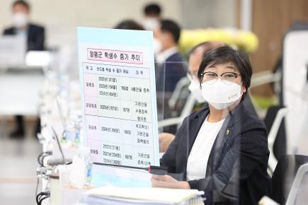 이에 대해 김현철 교육장은 “현재 양평군에는 총 5,015세대 규모 택지개발이 이루어지고 있어, 전승희 의원이 지적하신 부분이 지역공동체 모두가 우려하고 있는 부분”이라고 공감하며, “현행 제도상 학교 신규설립에 대한 제한으로 기존 건물을 증축하거나 부지를 매입해서 할 수 있는 상황으로 판단했고, 이로 인해 규정과 현실 사이의 괴리감을 느끼고 있다”고 답했다.