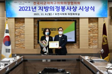 [한국뉴스타임=명기자] 포천시의회 박혜옥 의원이 전국시군자치구의회의장협의회에서 수여하는 지방의정봉사상을 수상하는 영예를 안았다.