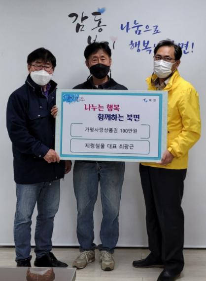 [한국뉴스타임=명기자] 북면 주민자치위원회에 위원장으로 활동 중인 제령철물 최광근 대표는 지난 4일 북면 행정복지센터를 방문하여 저소득 주민이 따뜻한 동절기를 맞이 하는데 조금이라도 도움이 되고 싶다며 가평사랑상품권 100만원을 기탁했다.