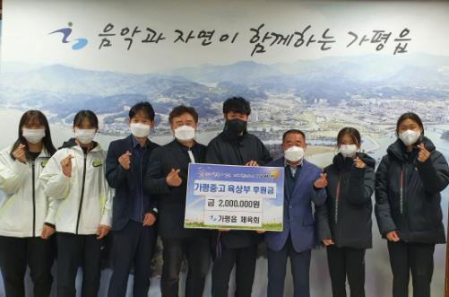 [한국뉴스타임=명기자] 가평읍 체육회는 8일, 가평읍행정복지센터에서 가평중·고 육상부에 2백만원의 후원금을 전달하고 우수한 성적으로 지역의 위상을 빛낸 선수들에 대한 격려의 시간을 가졌다.