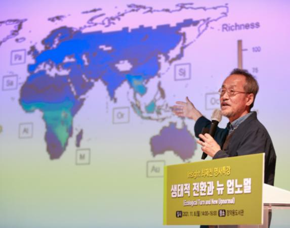 ‘생태적 전환과 뉴 업노멀’을 주제로 진행된 이번 강연에서 최재천 교수는 생물 다양성의 불균형이 만들어내는 세계적인 변화와 환경 문제에 대해 자연과 우리의 관계를 재정립하는 ‘생태적 전환’ 개념을 강조했다.