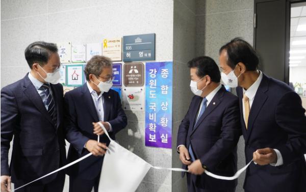 허영의원실에 따르면, 9일 여의도 국회의원회관 내에 강원도 국비확보 현장상황실 운영을 개시하는 현판식이 열려 예산 확보를 위한 총력전에 돌입했음을 알렸다. 현장상황실은 강원도 관련 예산의 국회 심의 동향을 신속하게 파악하여 도와 국회의 가교가 됨은 물론, 신규 예산 발굴 및 증액 노력에도 나서는 등 적극 대응에 나설 계획이다.
