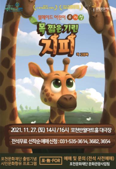 [한국뉴스타임=명기자] 재단법인 포천문화재단은 오는 11월 27일 오후 2시, 오후 4시 2회에 걸쳐 포천 반월아트홀 대극장에서 온 가족이 즐길 수 있는 웰메이드 어린이 뮤지컬 '목 짧은 기린 지피'를 개최한다.