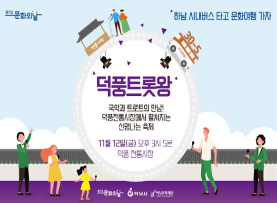 [한국뉴스타임=명기자] 하남문화재단이 오는 11월 12일 덕풍전통시장에서 경기도 문화의 날 '하남 시내버스 타고 문화여행 가자' ‘덕풍트롯왕’을 개최한다.